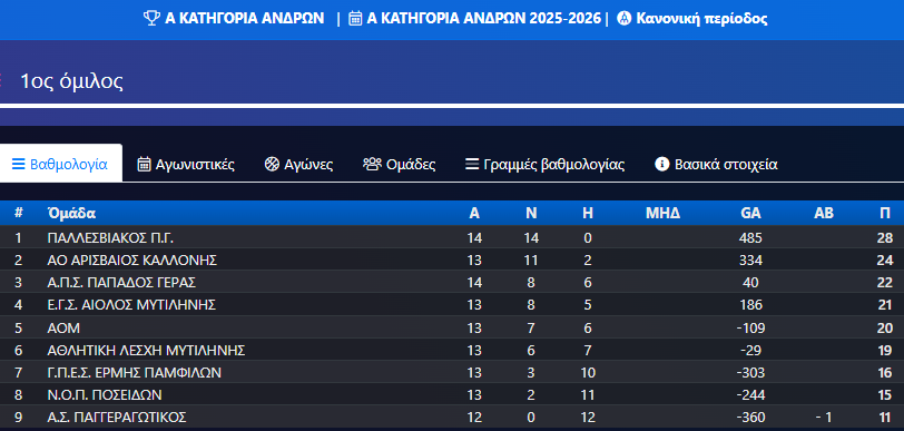 Βαθμολογίες Πρωταθλημάτων Τ.Ε. Ε.Ο.Κ. Λέσβου 2023-2024