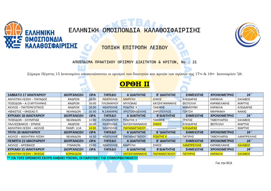 Βαθμολογίες Πρωταθλημάτων Τ.Ε. Ε.Ο.Κ. Λέσβου 2023-2024 read more